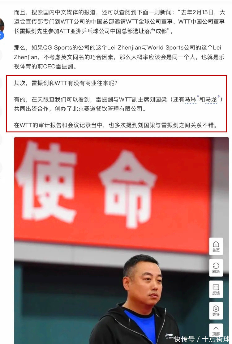 据腾讯体育《霍森专刊》报道,大概率就是前乐视体育的CEO,然而最有意思的是,这位雷振剑曾经还与两位中国乒坛人物共同出资创办了一家名为“北京赛道”的餐饮公司,这两人分别就是现任国乒女队教练马琳,和中国乒协主席刘国梁,除此之外,腾讯体育《霍森专刊》还写了这么一句话:在WTT审计报告和会议纪录中,多次提到雷振剑与刘国梁关系不错