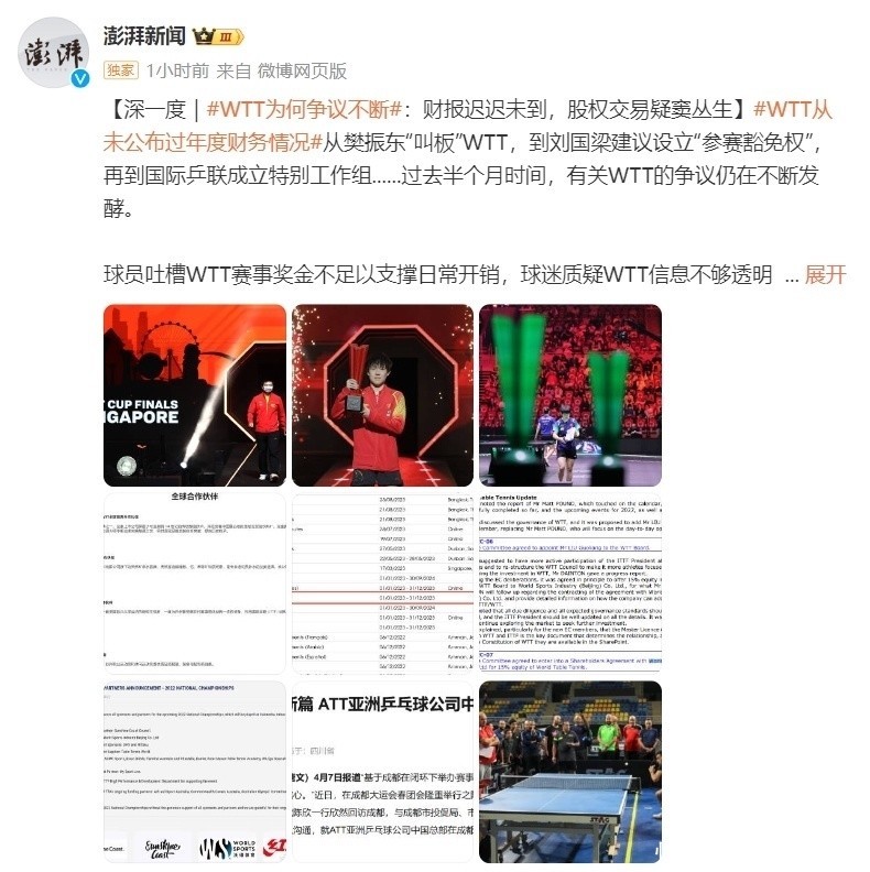 截止到目前,估计连樊振东自己都未曾想到,随着他的一声退赛,大众关注的焦点已经衍生到了WTT的财务问题上了,此前虽然有几家官方媒体对WTT的财务和股权提出了质疑,但都仅限于地方台媒体范围,然而北京时间1月9日,《澎湃新闻》在社交平台上发布了一篇长达3000余字的深度长文,直指WTT股权交易疑窦丛生,且财务报告迟迟未公布于众!作为全国如此有影响力的官方媒体,公开要求WTT公布财务,这或许将是本次风波截至目前而言,最关键的转折点