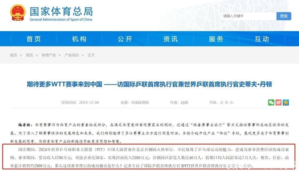 或许此时有人要说了,别人协会创立时间长、受众人群广,在赛事总收入高的情况下,球员奖金当然高了,但其实这也是WTT近几年来被不断抨击的原因:财务不清楚!WTT近3年里,只有2022年公布了年度财务报告,那一年WTT迫于“内部清算”的压力,才公布了年收入2640万美元的财务报告,然而这个2640万美元究竟是赚了还是赔了,无人知晓,但咱们继续拿单打奖金最高的中国大满贯举例,2024年12月4日《中国体育报》报道了WTT中国大满贯的收入构成,包括赛事票房收入5700万元、招商收入2500万元、餐饮住宿商业累计销售约2900万元,但WTT中国大满贯球员总奖金才多少?150万美元,你说是赚了还是赔了