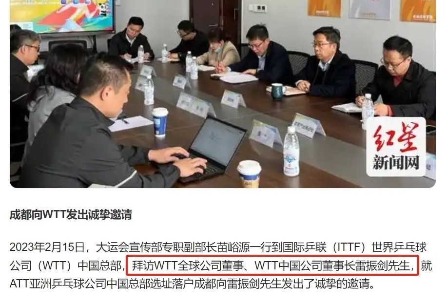 并且据红星新闻于2023年4月发布的《办赛营城谋新篇,ATT亚洲乒乓球公司中国总部有望落地成都》稿件中得知,雷振剑还是WTT全球公司董事、WTT中国公司董事长